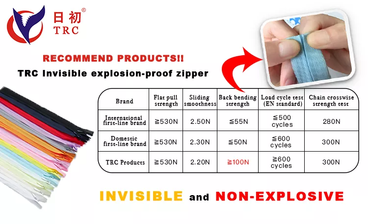 Dây kéo chống cháy nổ vô hình TRC (Băng ren) kết hợp hoàn hảo giữa sự sang trọng và độ bền. Băng ren tinh tế nâng cao sức hấp dẫn trực quan của hàng may mặc trong khi vẫn duy trì hiệu suất vượt trội như khóa kéo tiêu chuẩn.