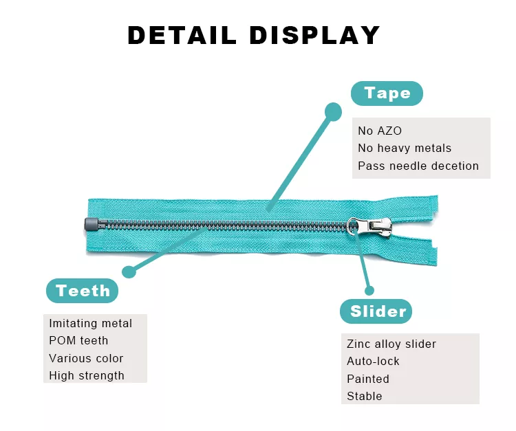 Mỗi khóa kéo nhựa TRC với răng có hình dạng đặc biệt đều trải qua quá trình kiểm tra chất lượng nghiêm ngặt trước khi xuất xưởng. Từ việc lựa chọn nguyên liệu thô đến quy trình sản xuất, chúng tôi xem xét kỹ lưỡng từng cấp độ để đảm bảo sự ăn khớp răng chính xác và việc đóng răng trơn tru, không bị giật. Hơn nữa, sản phẩm này còn trải qua nhiều thử nghiệm về khả năng chống mài mòn, độ bền kéo, độ bền màu và độ mịn, đảm bảo hiệu suất ổn định và màu sắc rực rỡ ngay cả trong môi trường sử dụng thường xuyên và đầy thử thách.