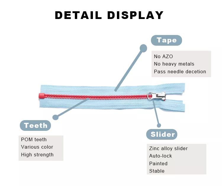 Khóa kéo nhựa tiêu chuẩn TRC được đúc phun từ polyoxymethylene hoặc các vật liệu nhựa có độ bền cao khác, đảm bảo răng được định hình tốt đồng thời mang lại độ êm ái tuyệt vời và khả năng chống mài mòn vượt trội trong quá trình sử dụng. Bề mặt của chúng hỗ trợ nhiều phương pháp xử lý màu khác nhau với độ bền màu tuyệt vời, cho phép màu sắc vẫn rực rỡ trong thời gian dài. Ngoài ra, kết hợp với băng polyester có độ bền cao, cấu trúc tổng thể chắc chắn và bền bỉ hơn, đáp ứng nhu cầu sử dụng thường xuyên hàng ngày.