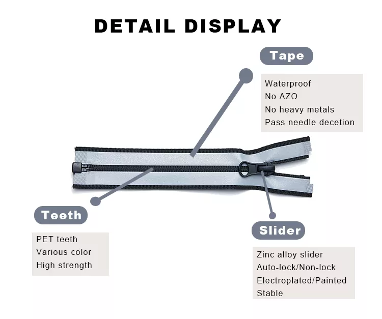 Dây kéo nylon chống thấm TRC được làm bằng băng polyester có độ bền cao và răng nylon bền, đồng thời được phủ một lớp màng chống thấm TPU hoặc PU chuyên nghiệp để ngăn chặn sự xâm nhập của hơi ẩm, mưa và bụi một cách hiệu quả. Và để đáp ứng nhu cầu ứng dụng đa dạng, TRC cung cấp ba bề mặt hoàn thiện—mờ, bóng và bán mờ—mỗi bề mặt có một vẻ ngoài và cảm giác độc đáo.
